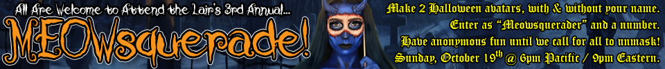 The Lair is a room where all are welcome. Women are in charge here (whether female by birth or by choice, i.e. "gurls") and all presenting as men shall be considered to be in understanding with and agreement to this. (No male chauvinist pigs allowed!) Otherwise, our rules are simple: